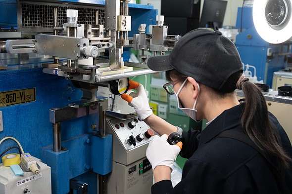 | Mr. Yamaki says Sigma’s factory operations weren’t impacted as much as other companies during the pandemic due to keeping all manufacturing in Japan and using local suppliers. Above: a technician in Sigma’s Aizu, Japan, factory applies the Sigma logo to a lens barrel. |