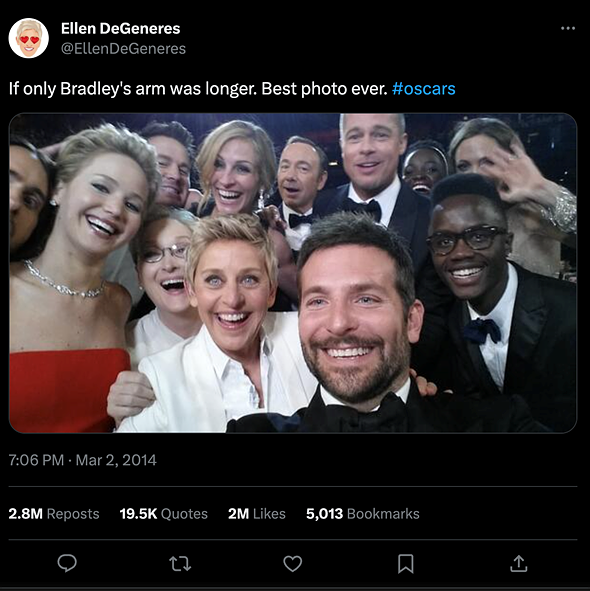 We were reminded of web rot again last week when a Twitter X user posted that several images were missing from the platform, including the 2014 selfie posted by then Oscars host Ellen DeGeneres during the show’s TV broadcast. The photo, taken by actor Bradley Cooper’s outstretched arm, crashed Twitter upon its posting and became one of the most viewed images of the year. Setting aside whether you’re a fan of the celebrities or deem the photo of value or not, its place in social media history is notable and worthy of preservation.