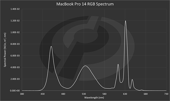 | The spectral power distribution of a white patch displayed on the MacBook Pro 14’s mini-LED LCD display. |