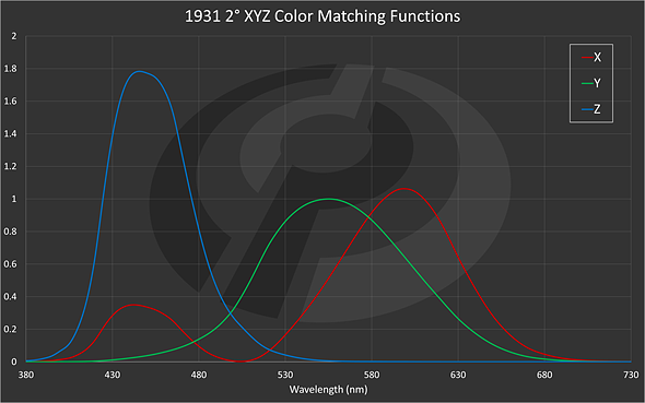 The full explanation of how the 1931 CMFs were derived is a bit dense. The oversimplified version is that they’re based on three imaginary colored lights, or primaries, that are so saturated a person could ‘match’ every single color a human can perceive by some positive combination of the three. There’s a red primary, labeled X, a green primary, labeled Y, and a blue primary, labeled Z, and the curves tell you how much of each light you would need in order to match every point on the visible spectrum from 380nm (violet) to 730nm (red).