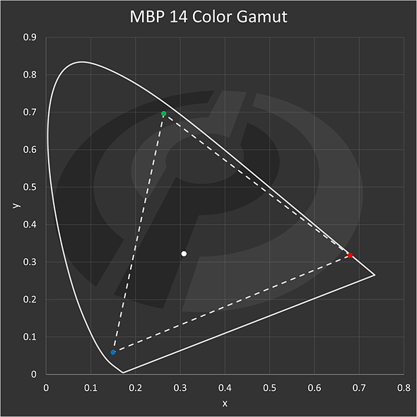 | The color gamut of my MacBook Pro 14 display, based on the manually calculated XYZ tristimulus values of the white point and the red, green, and blue primaries. |