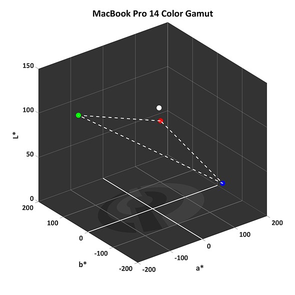 | MacBook Pro 14 primaries and white point plotted in the rectangular L*a*b* color space, using D50 as the reference white. |
