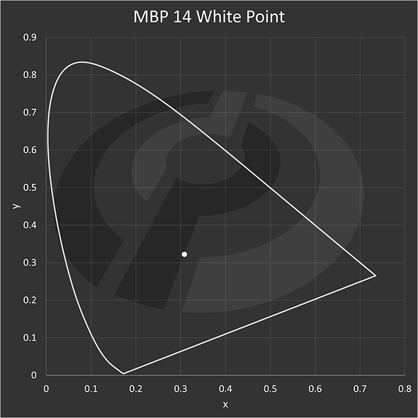 If I plot the MacBook Pro 14’s white point and RGB primaries in the standard L*a*b* color space, using Illuminant D50 as a reference white, this is what comes out: