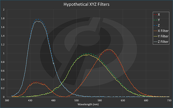 | These made-up XYZ filters are still quite accurate at parts of the curve, but some parts like the peak of the peaks of each filter, and most of the trailing end of the Y (green) filter would produce significant inaccuracies that have to be accounted for. |