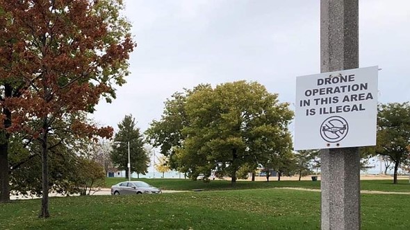 | This is a sign spotted in Chicago. Class G airspace is legal to fly in by the FAA’s standards, making this particular sign baseless. Photo: Antoine Tissier |