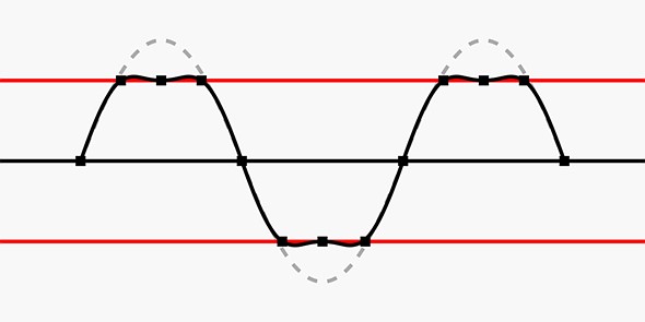 An example of clipping of a digital waveform. The red lines indicate full scale, and the waveform is shown before and after hard clipping (grey and black outlines, respectively). 32-bit float allows you to capture way beyond the traditional ‘full scale’ limits. Credit: Gutten på Hemsen, CC BY-SA 4.0, via Wikimedia Commons |